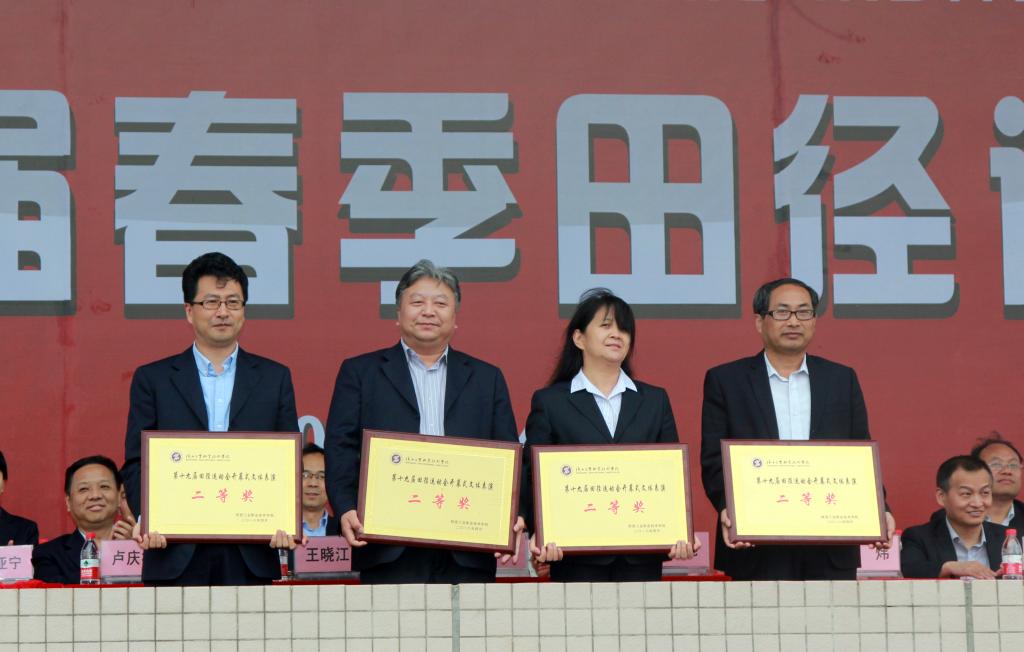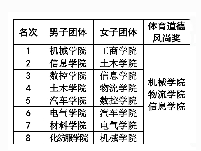 运动会总裁判长许耀锋宣布团体比赛成绩,机械工程学院、信息工程学院、数控工程学院分别获得男子团体总分前三名;工商管理学院、土木工程学院、信息工程学院分别获得女子团体总分前三名。党委副书记、副院长刘永亮宣读团体获奖、体育道德风尚奖、文体表演奖获奖名单,学院领导为获奖团体颁奖。